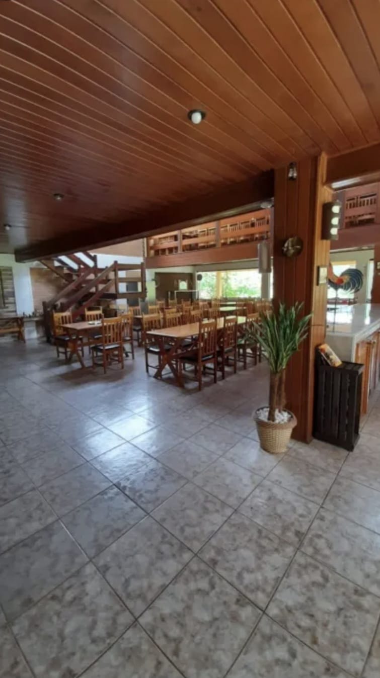 PRÉDIO DA RECEPÇÃO, BAR, COZINHA E RESTAURANTE – Prédio elegante com bela arquitetura, instalações e revestimentos em madeira. Espaços de convivência no entorno. Área construída de cerca de 500 m².